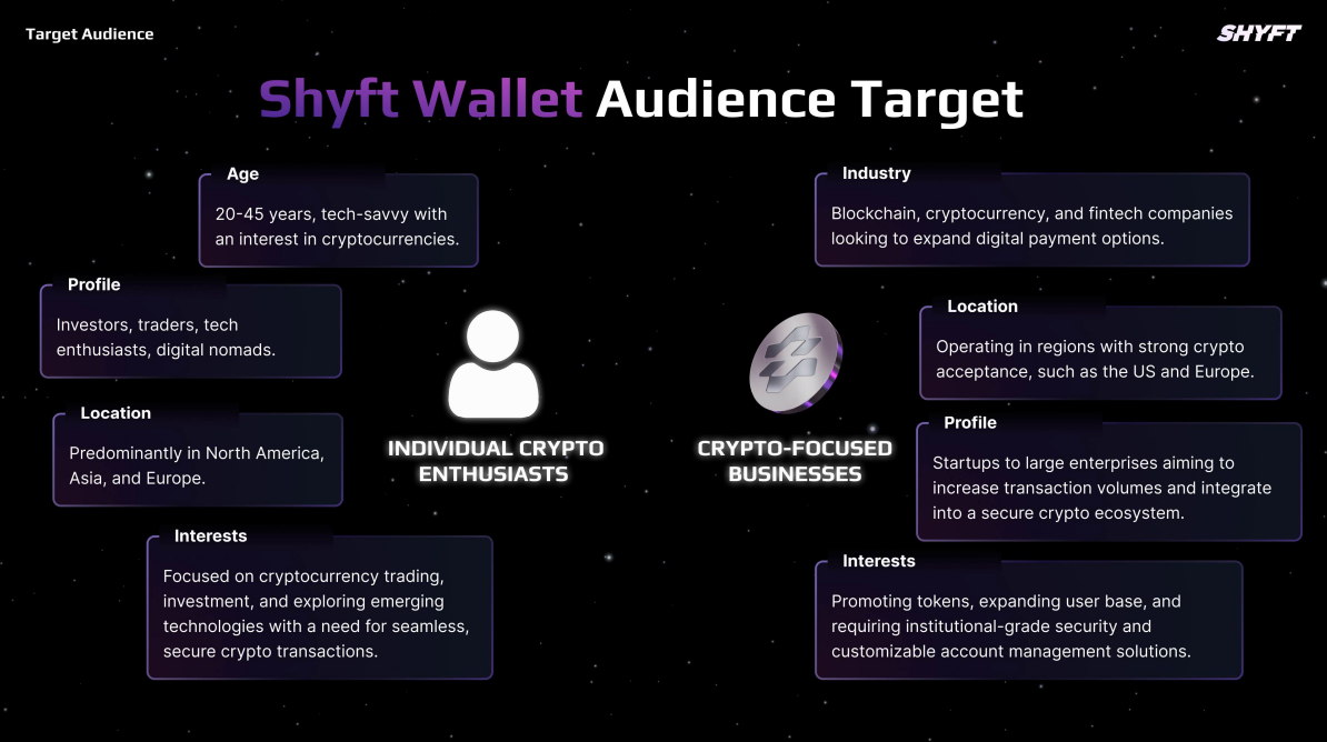 Shyft Wallet is designed to cater to a broad audience, from crypto novices to experienced traders and developers, depending on its specific features and capabilities. The target audience for Shyft Wallet, which includes two main groups: